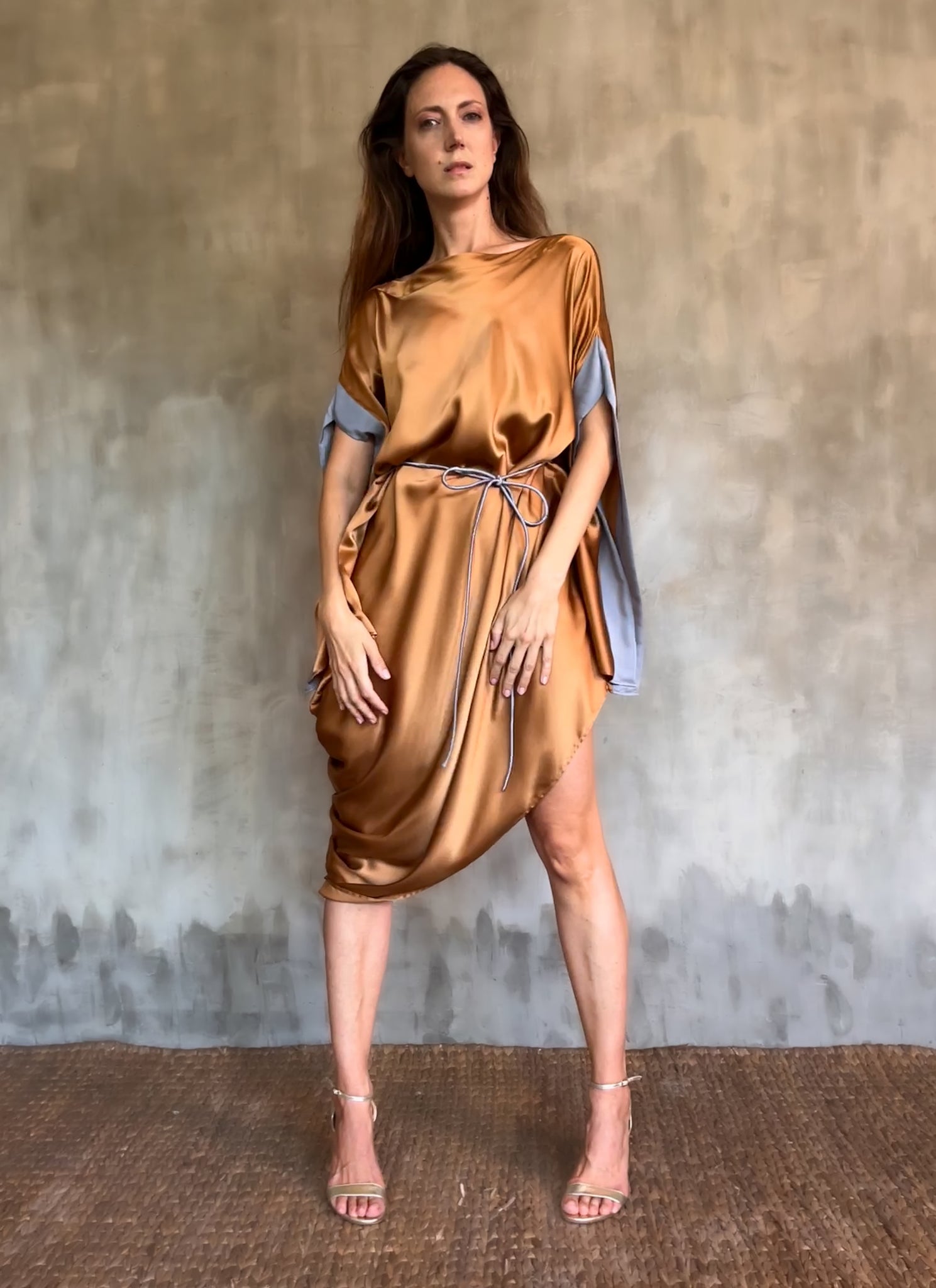 The Jogya silk dress is cut in a way that deconstructs it's original square form, creating a subtle asymmetry, a style statement we often play with. Wear it loose and easy or use the delicate belt string to change the silhouette bringing light touch of ancient Roman majesty.