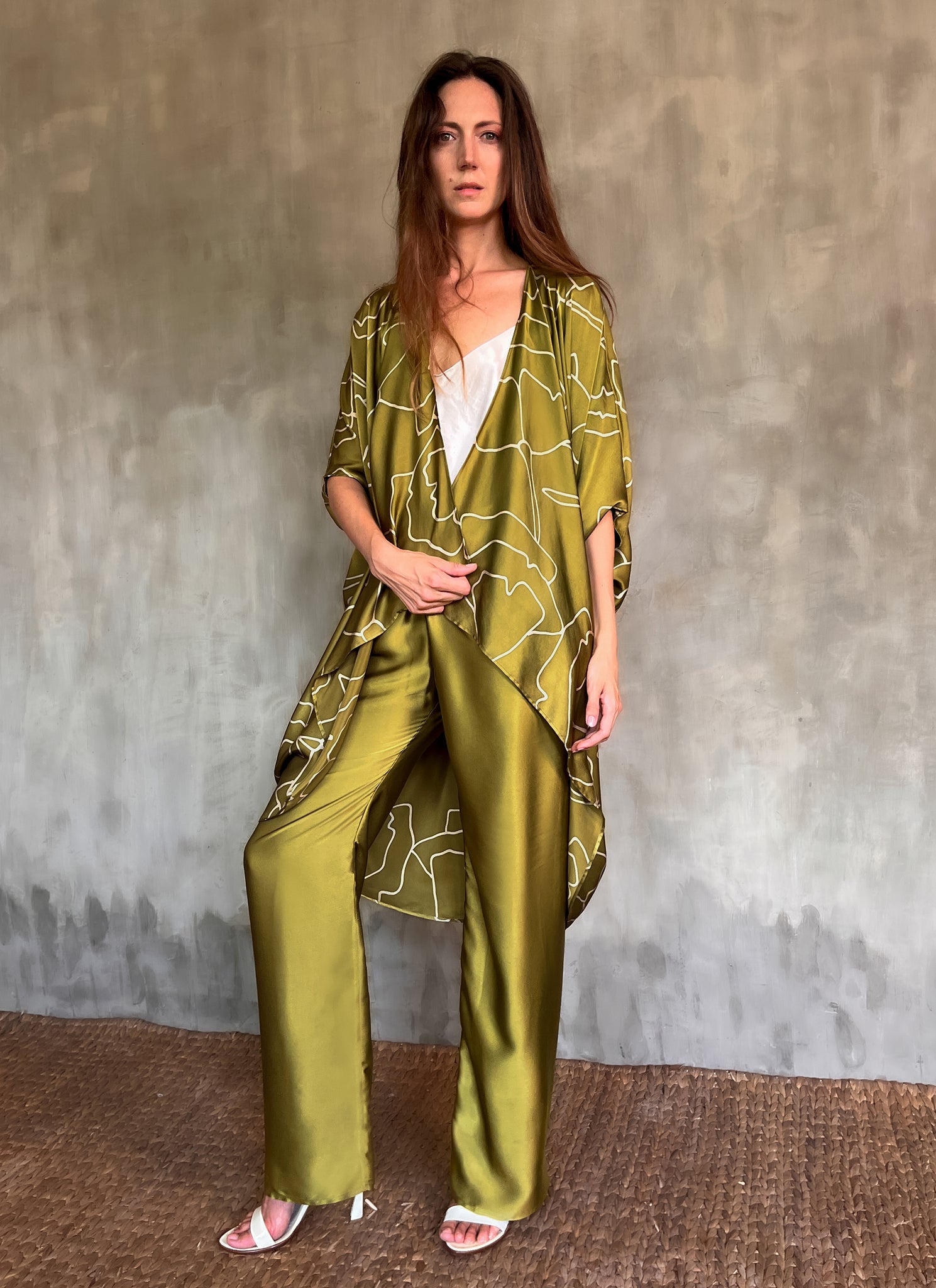 Our signature open kaftan, crafted from silk, is the ultimate in effortlessly chic. It's loose silhouette and three-quarter sleeves makes it strong as a statement piece and versatile enough for layering.